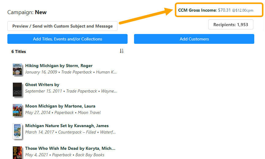 The CCM Gross Income that you’d see on an individual campaign covers all costs of the program, which is free to booksellers as part of your Analytics subscription. This includes both the store earnings and Edelweiss’s fee to publishers for use of the platform, so the amount you see as gross fees will generally be about 25% more than the payout to you.